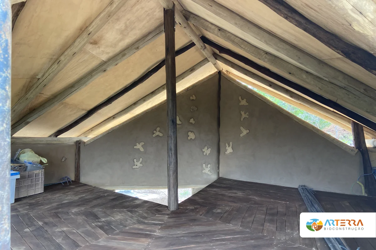 Internamente foi executada a demarcação e correção dos encontros entre paredes e elementos de madeira, testes de rebocos de terra, regularização das superfícies e rebocos grossos e finos à base de terra. Construímos também o sofá artesanal com acabamento fino à base de cimento queimado branco com agregados rochosos e componentes poliméricos.